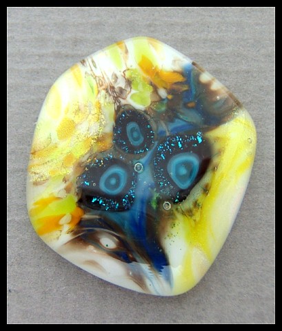 Another pendant in the same glass and then a couple of cabs and a pendant in the "other" new glass. The cab with the lime, yellow and deep inky blue is absolutely stunning in real life.