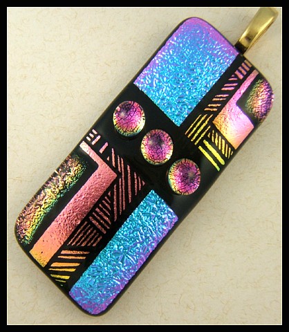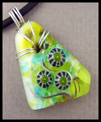 This gorgeous little lime green one is layers of art glass, dichro, hand made murrini and a touch of hand painted silver lustre. This one has been wrapped in sterling silver wire.
