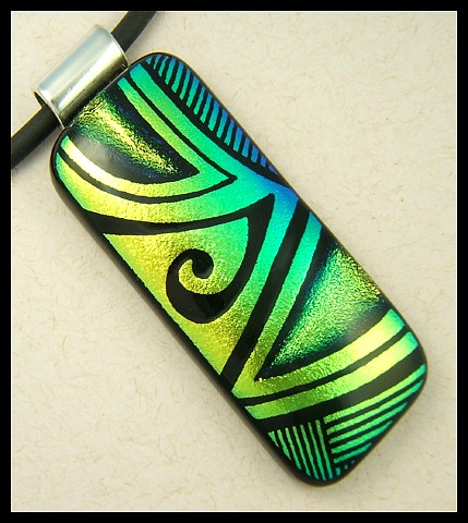 The first one pictured is an amazing shaded green glass that runs from a citrus colour through to a gorgeous peacock. A combination of satin and glossy dichroic glass that has been hand engraved in a sort of tribal design.