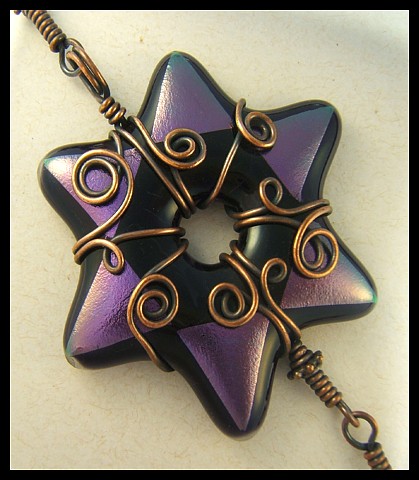 And finally sun catcher number two. This time with translucent purple glass, Swarovski crystals again and a faceted purple pendulum crystal. All wrapped in antiqued copper wire. I LOVE the colours in this baby!!